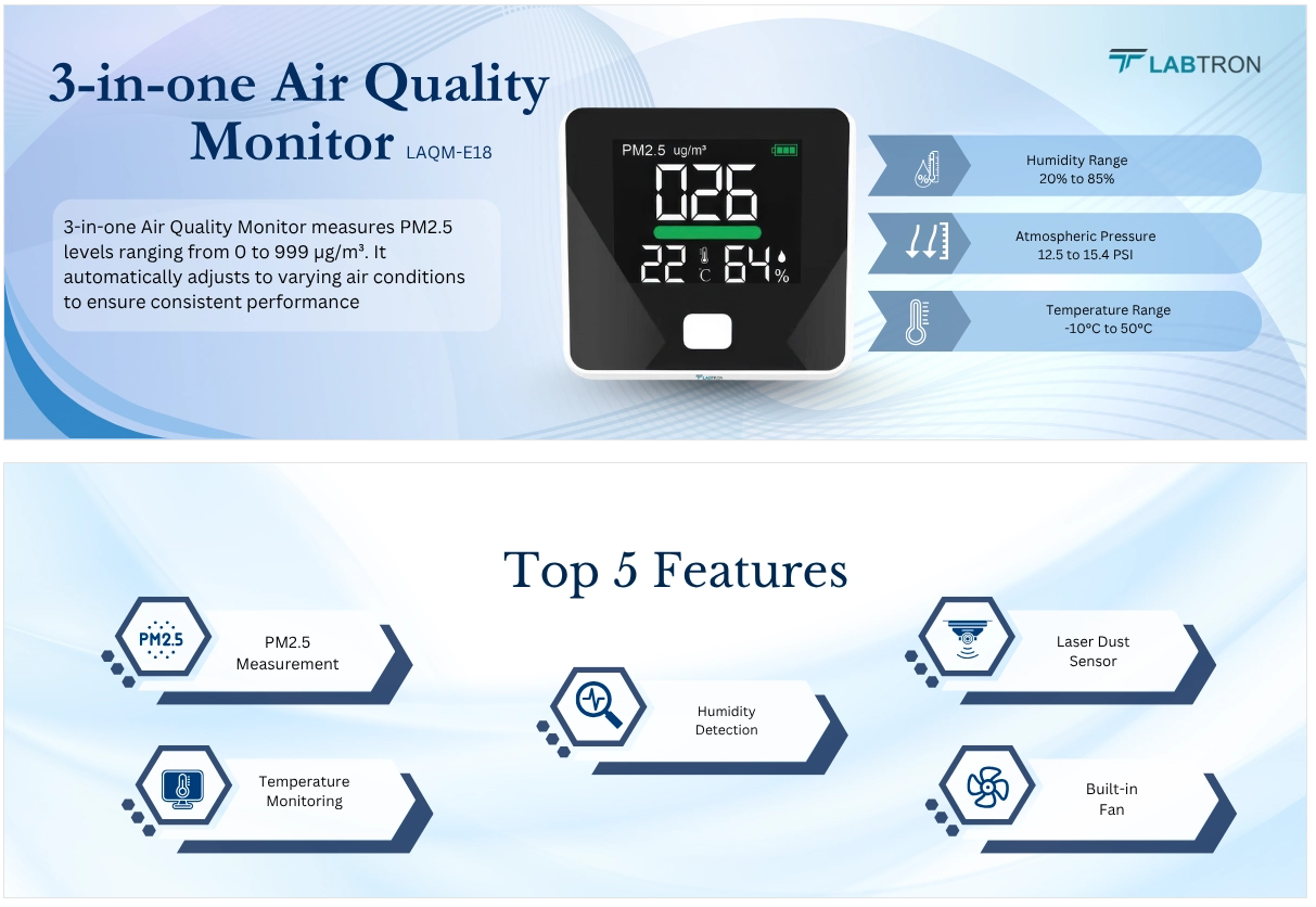 我们的三合一空气质量监测仪非常适合工业设施,它通过测量 PM2.5、温度和湿度水平,确保符合法规要求、保障工人安全并优化室内空气条件。