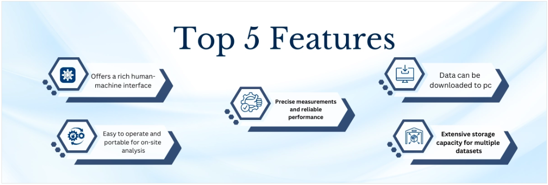提供丰富的人机交互界面 操作简便,便于携带,适合现场分析 测量精准,性能可靠 数据可下载至电脑 海量存储空间,可存储多个数据集 包含多种可选功能,满足个性化需求