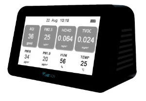 测试参数 PM2.5, PM1.0, PM10,AQI,HCHO(甲醛),温度,湿度,日期,时间 温度范围 -10°C~+50°C 存储温度 -10°C~60°C 湿度范围 20%~85% 气压 12.5~15.4 PSI CO2测量范围 400~5000 PPM PM2.5/PM1.0/PM10测量范围 0~999μg/m³ HCHO测量范围 0.001~1.999mg/m³ TVOC测量范围 0.001~9.999mg/m³ 探测方式(CO2) 红外线(NDIR) 探测方式(PM) 激光散射 探测方式(HCHO,TVOC) 半导体传感器 采样时间 1.5秒 电源 3000mAh 可重复充电锂电池,通过USB端口充电。 尺寸 131*78*67.5mm 重量 340g